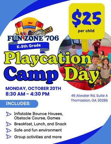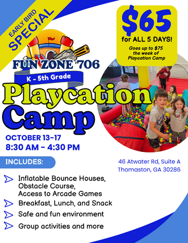 Fun Zone 706 Playcation CampAge Requirement: Completed Kindergarten thru 5th Grade. Pricing: $65/child per week or $25/child per day (walk-in). $15/child per day if picking up between 4:30 pm - 6 pm. Address: 46 Atwater Rd. Suite A, Thomaston, Georgia 30286 Welcome to Fun Zone 706 School Break Camp! This is one camp your children will not forget. Our goal is to provide a fun, engaging, and safe environment where kids can let their imaginations run wild and create lasting memories. Our Mission:At Fun Zone 706, we aim to create an unforgettable experience filled with fun, friendship, and exploration. Join us for a week full of laughter, adventure, and new friendships! Tentative Daily Schedule:8:30 am - 9:00 am: Breakfast & Morning Check-In